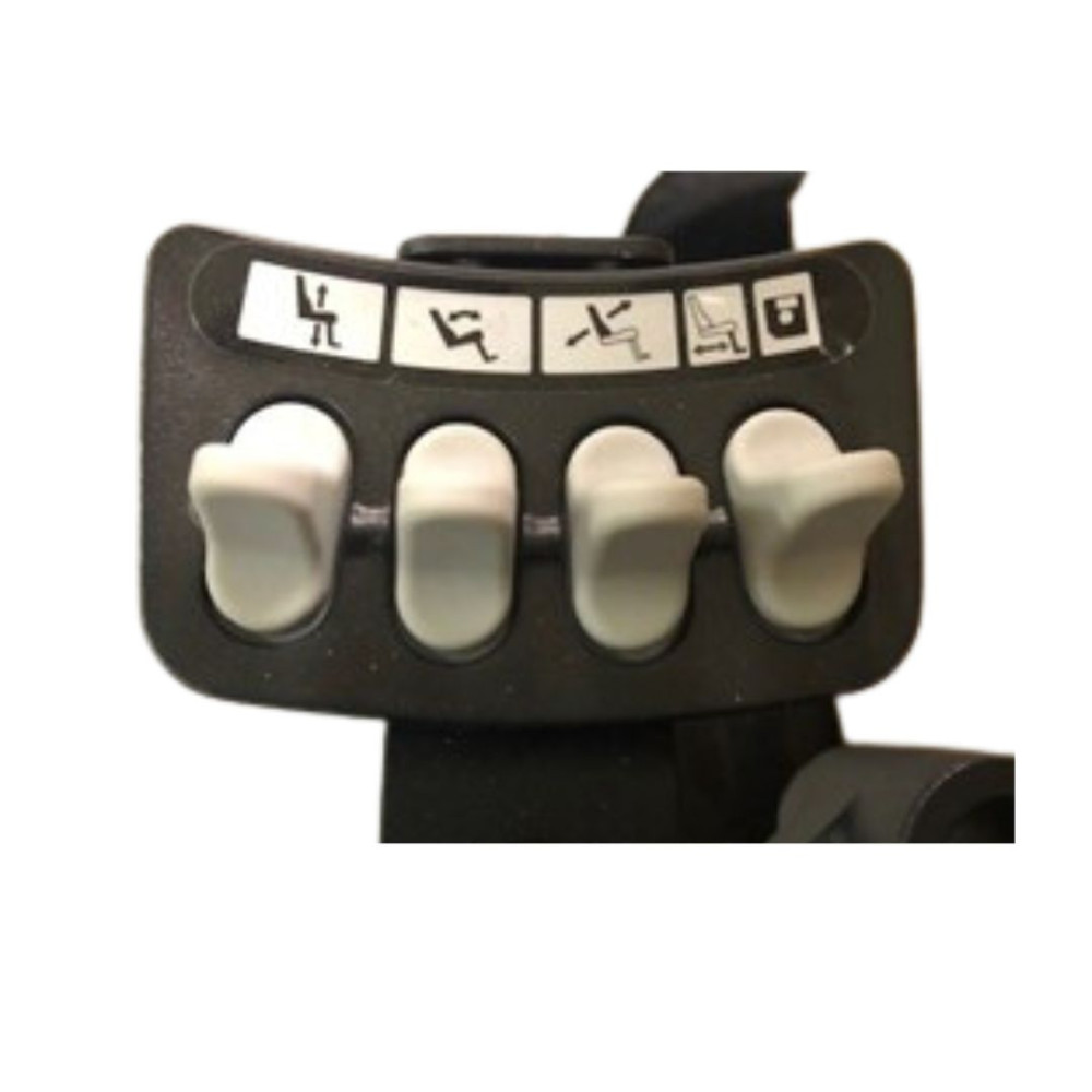 The electronic controller is mounted on the RIGHT hand side and is used to adjust tilt,recline, elevating leg rests, seat elevation and the drive speed. Power button can be used as standard or is switch adapted for easy use.